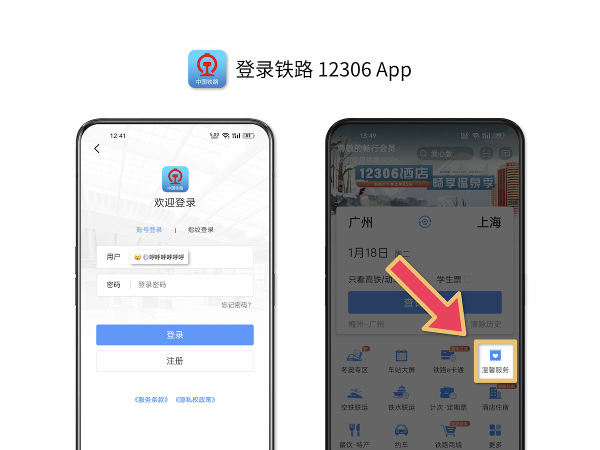 第一步,在手机中安装 铁路 12306 App。安装完成后,打开 app,输入账号、密码登录,并根据提示完成短信核验或人脸核验。如需为他人申请或情况紧急,可跳过此步骤。