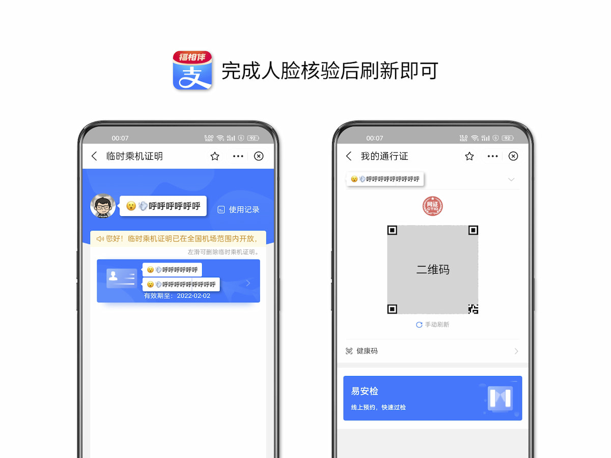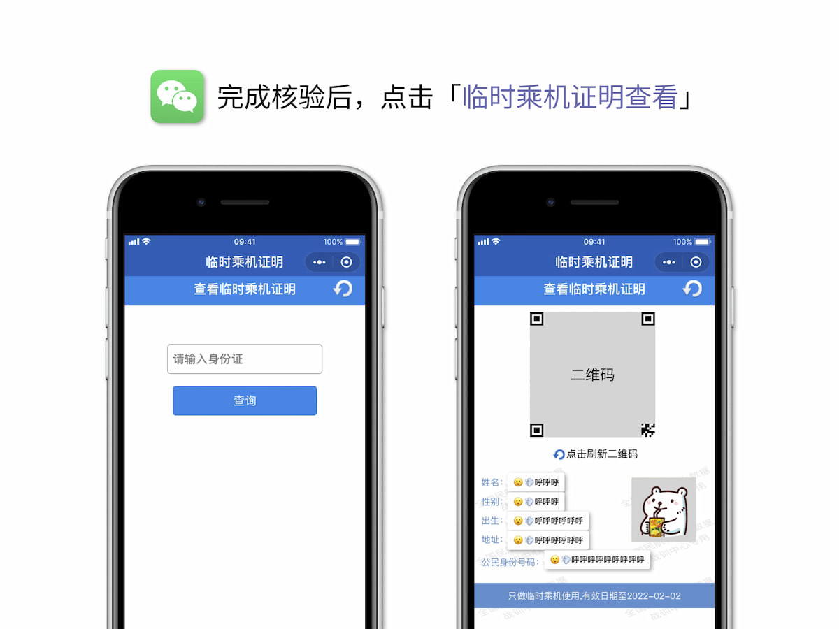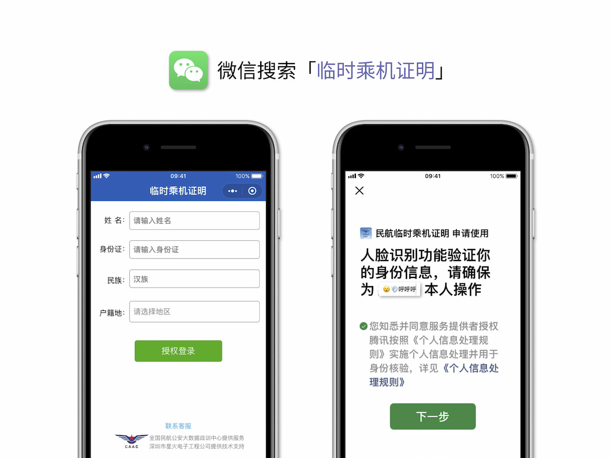 而搭乘飞机的乘客,可通过民航公安于 2019 年正式上线的「民航临时乘机证明」小程序办理「电子临时乘机证明」,在值机与安检时使用。