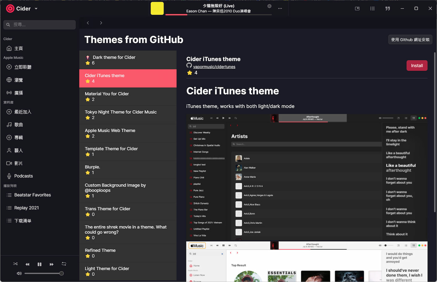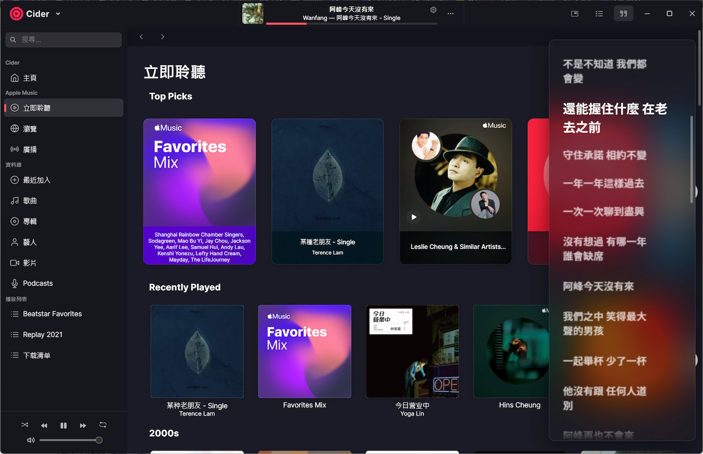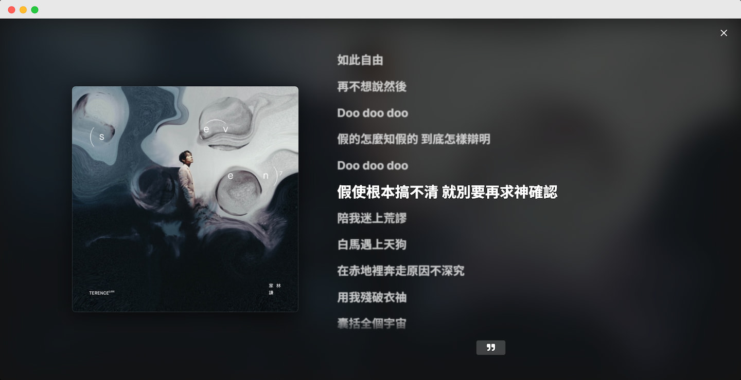因为 Apple 的「偏心」,Apple Music 只能够在官方客户端中显示歌词,但不包括 iTunes 与 Apple Music 网页版。而 Cider 在其客户端中,提供了动态显示歌词的功能。