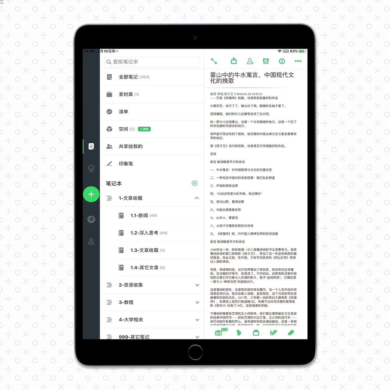 课前,拿上 iPad,拿上 Pencil,轻松上阵。课上,借助 iPad 的分屏功能,一边在课本上做笔记,一边搜索课外知识、翻阅之前的笔记,从容不迫。课后,在电脑上整理课堂笔记,无缝衔接。对我来说,将 iPad 作为上课、学习,以及轻度的生产力工具,我找到一种更符合自己风格的使用方式 —— 更快地获取知识、有条理地管理知识、方便分享与后期回顾,而不是仅停留于「爱奇艺、刷抖音、玩王者」的层面。