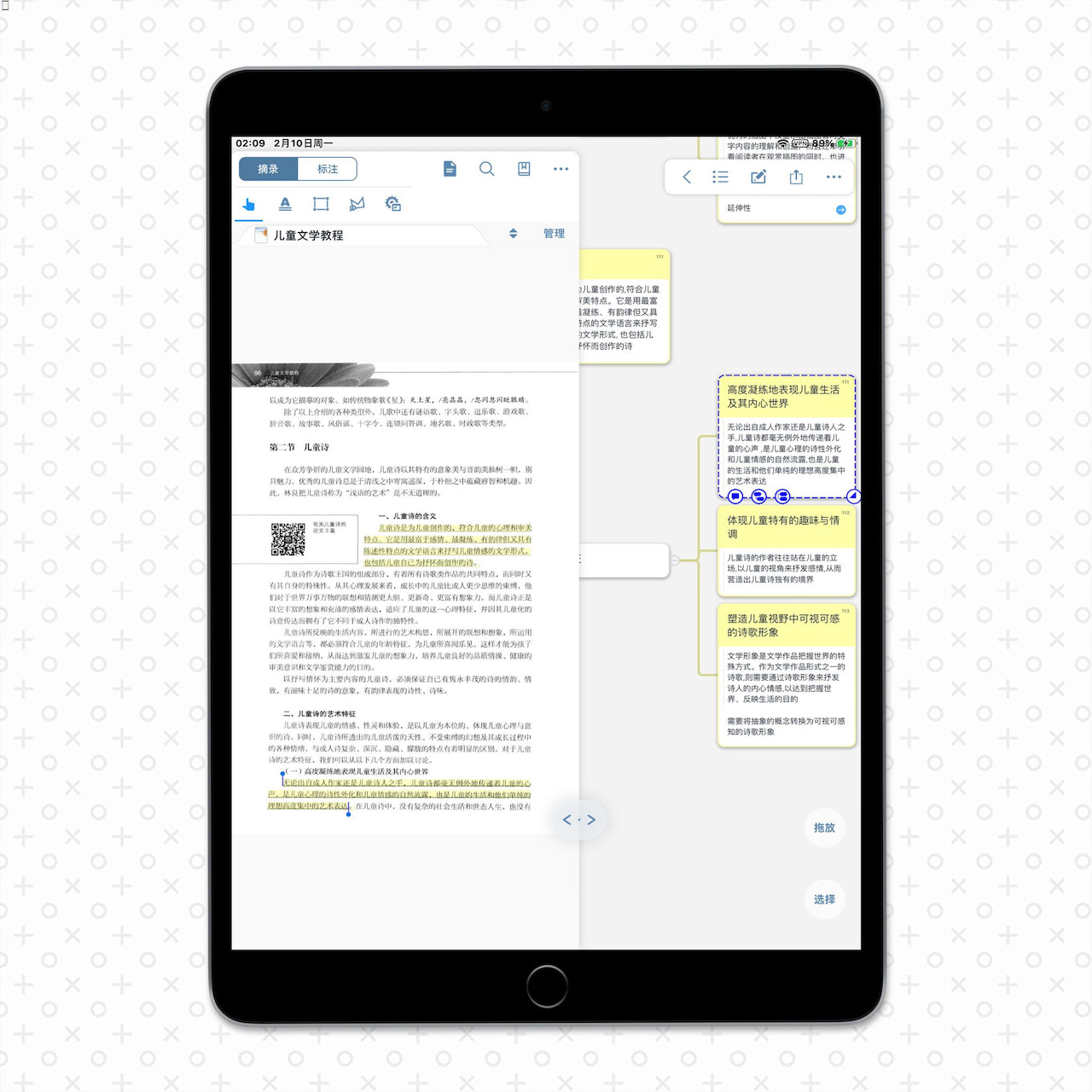 MarginNote 会自动根据书中的摘录生成导图,方便后期的整理与回顾,节省了手动制作思维导图的时间,这也是 MarginNote 历代相承的「杀手锏」。在课上,我会切换到学习模式,屏幕左侧显示课文,右侧显示思维导图,在讲课的空隙通过拖放卡片来快速整理思维导图。回到宿舍,iPad 上的笔记自动同步到 iCloud 上,打开 MarginNote 的 macOS 客户端便能够对笔记进行进一步的梳理,补充课堂上遗漏的知识点。