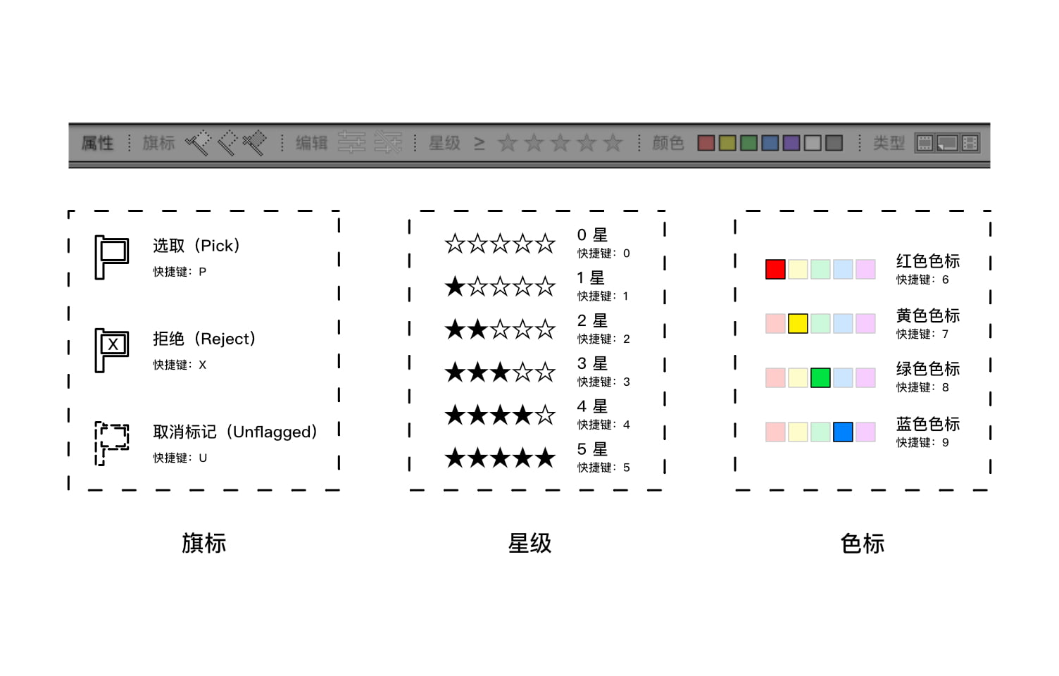 在实际中,你可以根据自己的喜好、习惯构建一套自己的标签系统,按照照片等级进行分类。标签能够为用户提供一个大致的分类系统,类别数量不宜过多,建立后需长期遵循这一套系统进行标记。需要注意的是,旗标(Pick、Rejected、Unflagged)标签只在 Lightroom 中适用,不会写入到 Xmp 元数据文件内,Adobe 旗下其它应用也无法读取该标记。